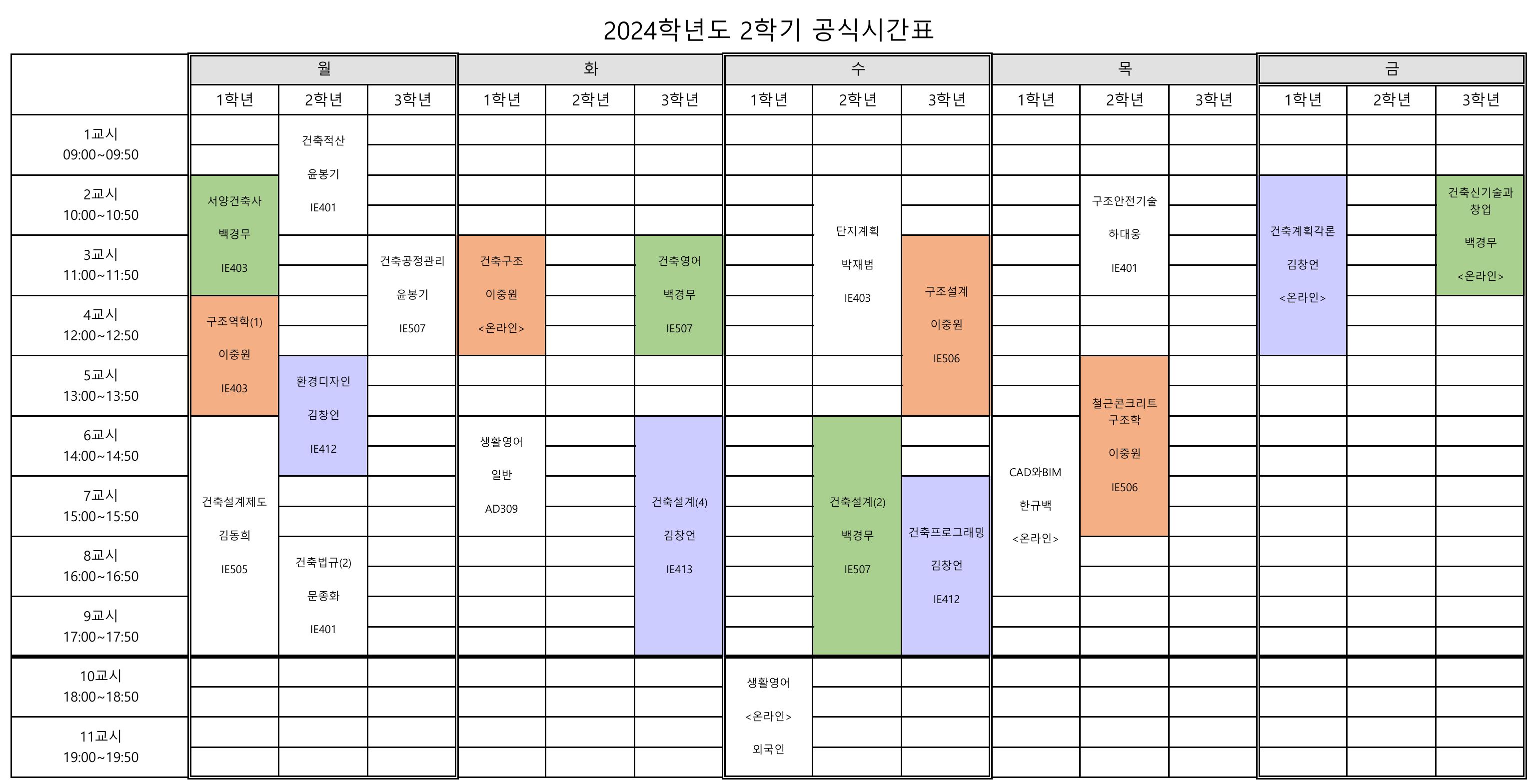 건축과 2024-2 시간표입니다.